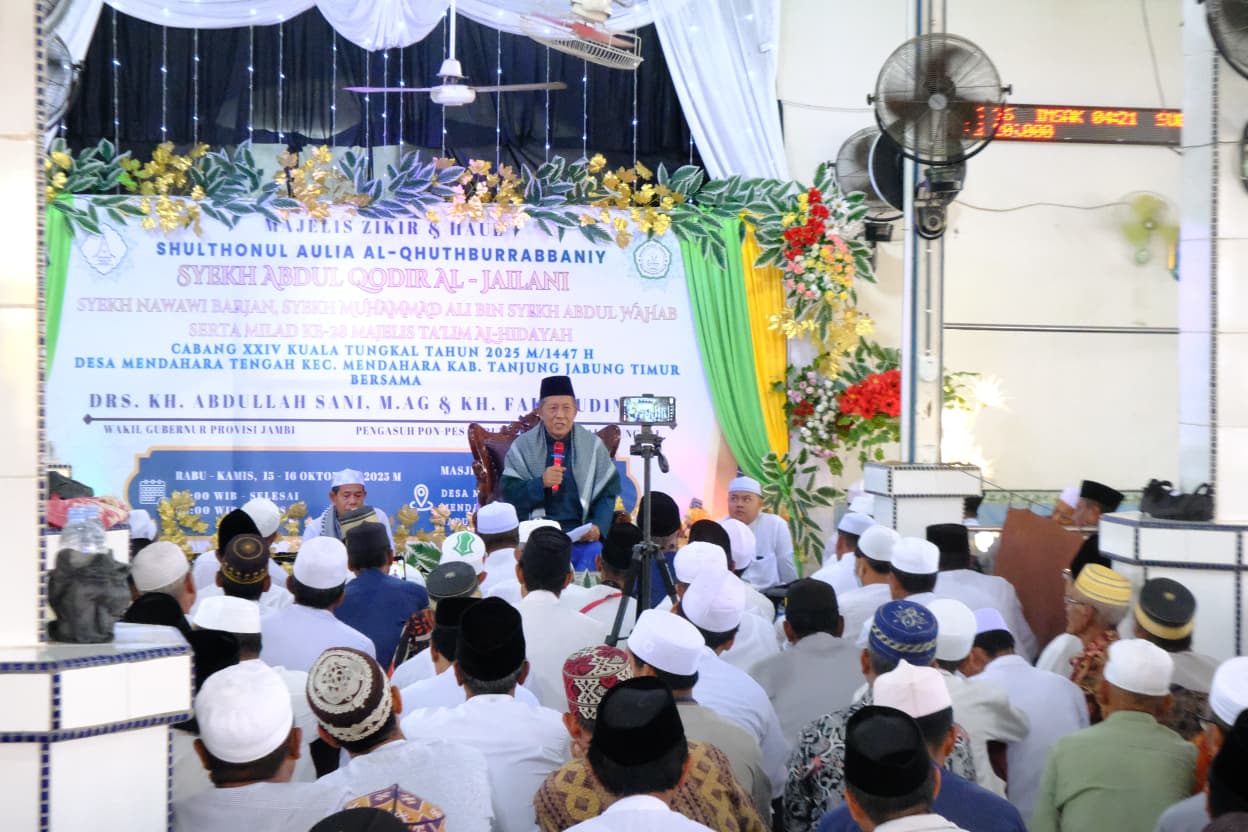 Muara Sabak, Salimbai.id – Wakil Gubernur Jambi Drs. H. Abdullah Sani, M.Pd.I menghadiri dan juga sekaligus menjadi penceramah dalam kegiatan Tabligh Akbar dalam rangka peringatan Haul Syekh Abdul Qodir Al-Jailani, Syekh Nawawi Barjan, Syekh Muhammad Ali Bin Syekh Abdul Wahab serta Milad Ke-28 Majelis Taklim Al-Hidayah yang dilaksanakan di Masjid Agung Nurul Hidayah, Desa Mendahara Tengah, Kecamatan Mendahara, Kabupaten Tanjung Jabung Timur, Kamis (16/10/2025).